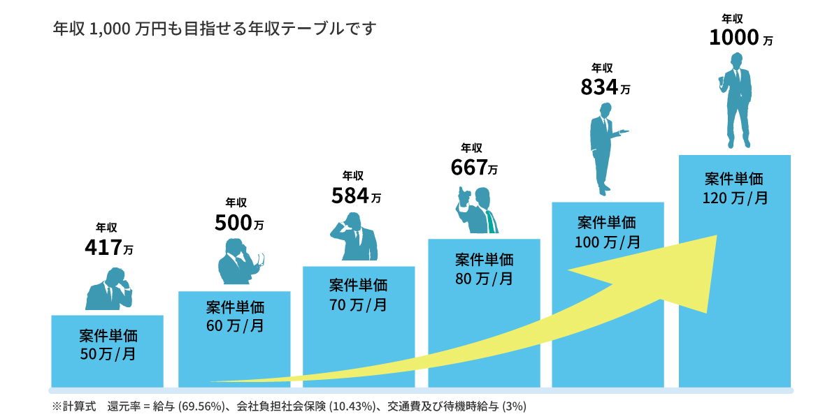 単価連動型の報酬体系、単価が上がれば上がっただけ給与に反映されます。SES業界の一般的還元率が65%~70%の中、カンゲンゲージェントは83%~95%圧倒的高還元で年収UPを実現します。